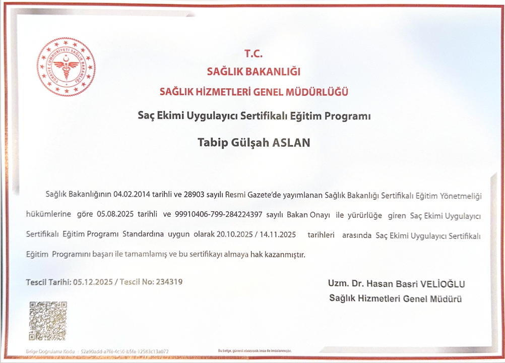 Dr. Gülşah Aslan, Sağlık Bakanlığı tarafından düzenlenen “Saç Ekimi Uygulayıcı Sertifikalı Eğitim Programı”nı başarıyla tamamlayarak, uluslararası standartlarda saç ekimi prosedürlerini uygulama yetkinliğini belgelemiştir. Hastalarımıza sunduğumuz tüm hizmetler, bakanlık onaylı uzmanlık ve tıbbi profesyonellik çerçevesinde yürütülmektedir.
