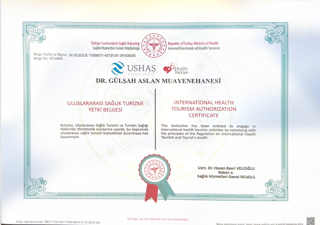 Kliniğimiz, T.C. Sağlık Bakanlığı tarafından verilen Uluslararası Sağlık Turizmi Yetki Belgesine sahiptir. Bu belgeyle, yurt dışından gelen hastalarımıza güvenli, yasal ve kaliteli sağlık hizmeti sunma yetkisine sahibiz.